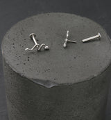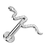Threadless labret with a snake design on top. Made from 14kt white gold. Disk size is 3mm. Choose your gauge: 18G or 16G. Length is 5/16" (8mm). Sold individually (2 pieces - top and bottom). For healed piercings.