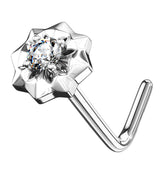 Charming 14kt white gold L bend nose ring with a sunburst on the end that has a sparkling cz gem in the middle. The sunburst measures at about 4mm. The length is 1/4" (6mm) and the size is 20G. Sold individually (1pc).
