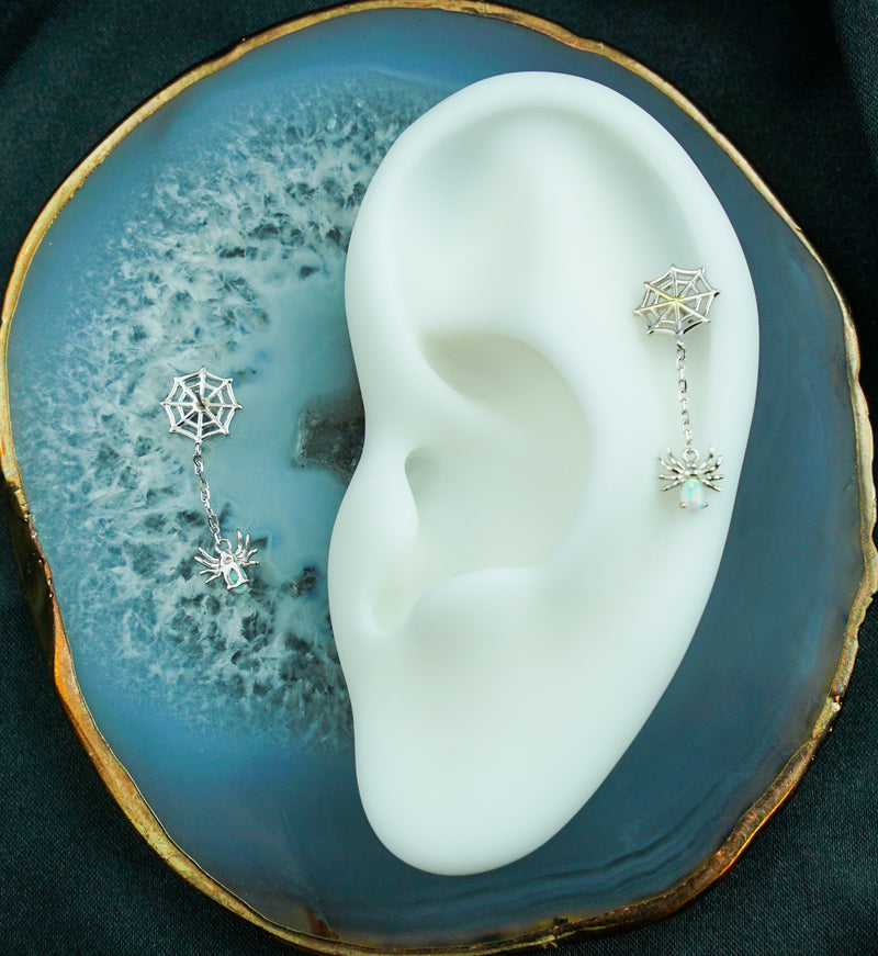 14kt nickel-free white gold threadless top piece that has a spiderweb design with a dangling spider that is accented with a synthetic, white opal gem. The pin size is 25G and fits most threadless posts. The size is about 25mm x 8mm (including dangle). Amazing top to add to your cartilage or tragus piercing! Sold individually.