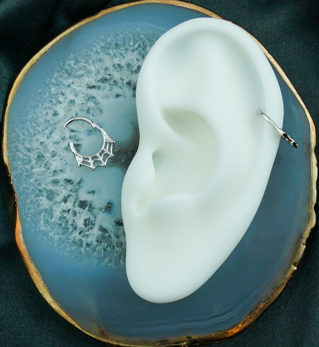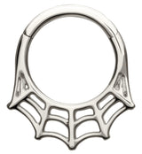 14kt gold hinged segment ring that has a spiderweb design that has a spiderweb style and design. Made from high quality 14kt gold. Hinged style makes for easy to insert and remove. Size is 16G with an inner diameter size of 5/16" (8mm). Sold individually (1pc).