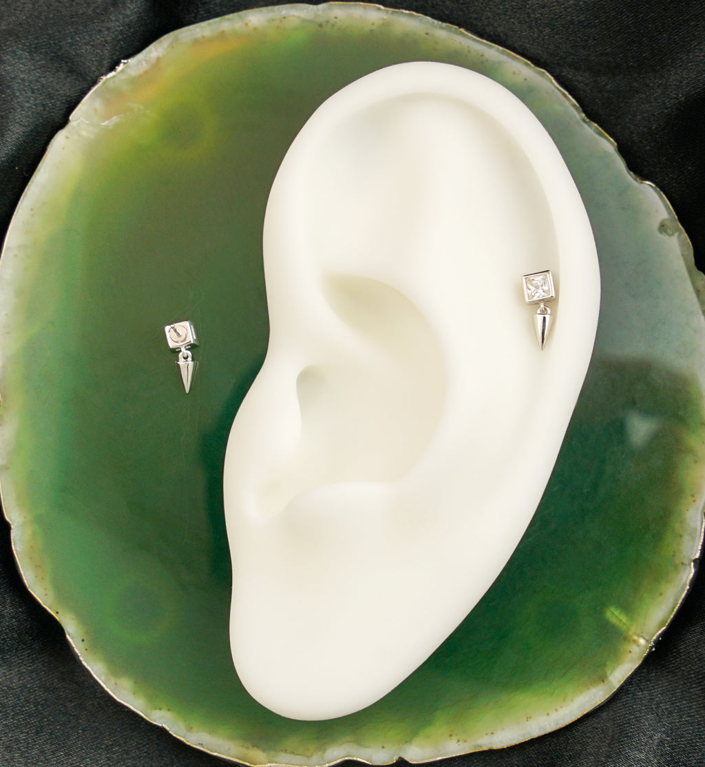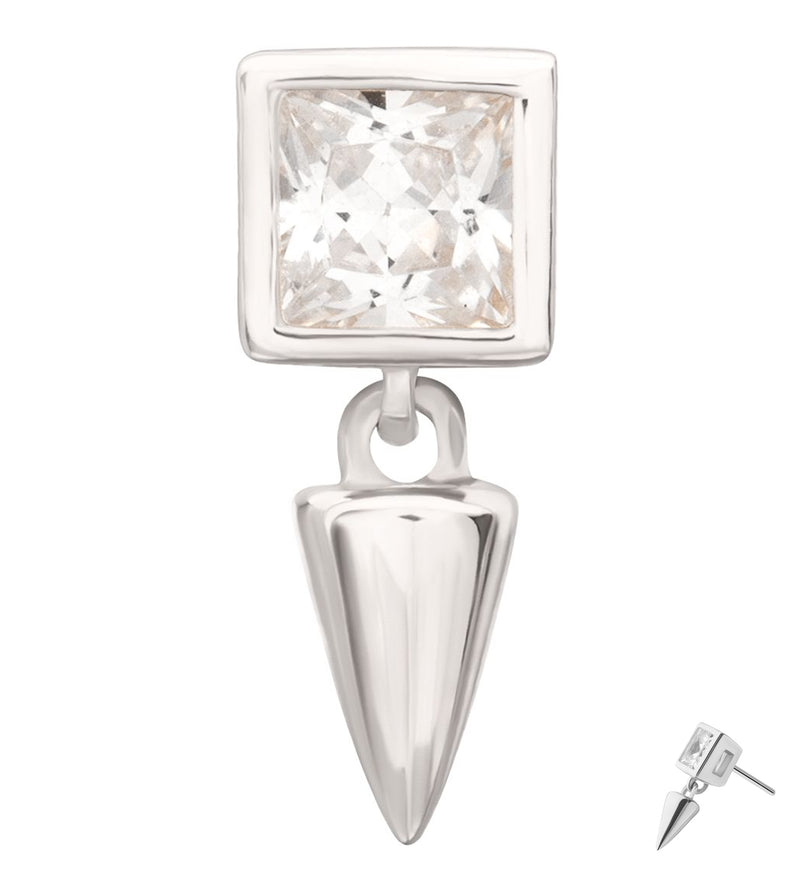 14kt white gold, threadless top piece that has a square, bezel set, 4mm clear cz gem on top that has an attached, dangling cone that measures about 4mm in length. Made from 14kt nickel-free white gold with a 316L stainless steel pin. Pin size is 25G. Length is approximately 5mm. Top size measures 8.7mm x 3.4mm. Sold individually (top only).