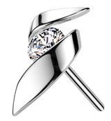 14kt nickel-free white gold threadless top piece that has a ribbon-like design that is swirling around a clear cz gem. The gem size is 2mm. Pin size is 25G and fits most threadless posts. The size is about 6mm x 3mm. Fun top option to add to your cartilage or tragus piercing! Sold individually.