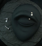 Curved barbells decorated with a dangling, teardrop cz design on top. The top piece has a threadless design that makes it easy to put in and remove. The top design measures 9mm x 3mm. Made from 14kt white gold with an inner length of 5/16" (8mm) and a 16G size. Complete with a threadless 3mm ball on the end. Sold individually. Dangling jewelry choice for your eyebrow or rook piercings!