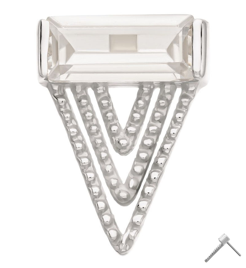 This elegant and versatile 14kt White Gold Tri-Layered Point Baguette CZ Threadless Top is perfect for cartilage or tragus piercings. Made with nickel-free white gold and a 316L stainless steel pin, it offers both style and durability. This piece has a 25G pin that measures about 5mm and a top design size of about 7.5mm x 5.2mm. Sold individually.