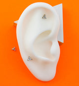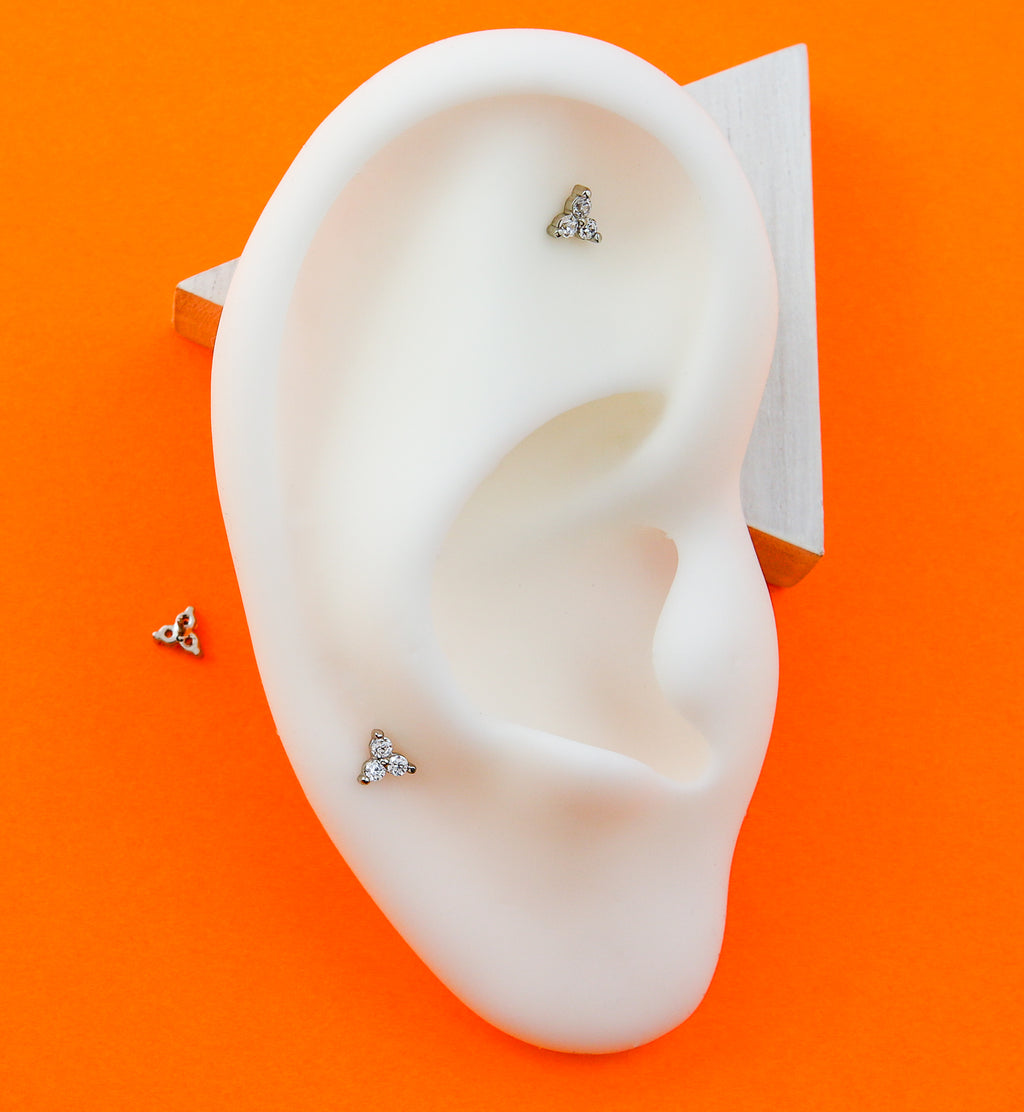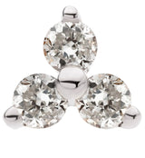 Stunnning 14kt white gold top piece that has a triple round, clear cz gem design on top. Fits all threadless posts. Made from 14kt nickel-free white gold with a 316L stainless steel pin. Top size: 3.5mm x 3.5mm. Pin size is 25G. Pin length is approximately 5mm. Sold individually (top only).