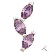 Purple threadless top piece that has a triple, marquise, amethyst cz gem design that resembles a growing vine. Made from 14kt nickel-free white gold with a 316L stainless steel pin. Pin size is 25G. Length is approximately 5mm. Top size measures at 10.3mm x 4mm. Sold individually (1pc-top only). Lovely jewelry top piece that you can interchange for cartilage or tragus piercings!