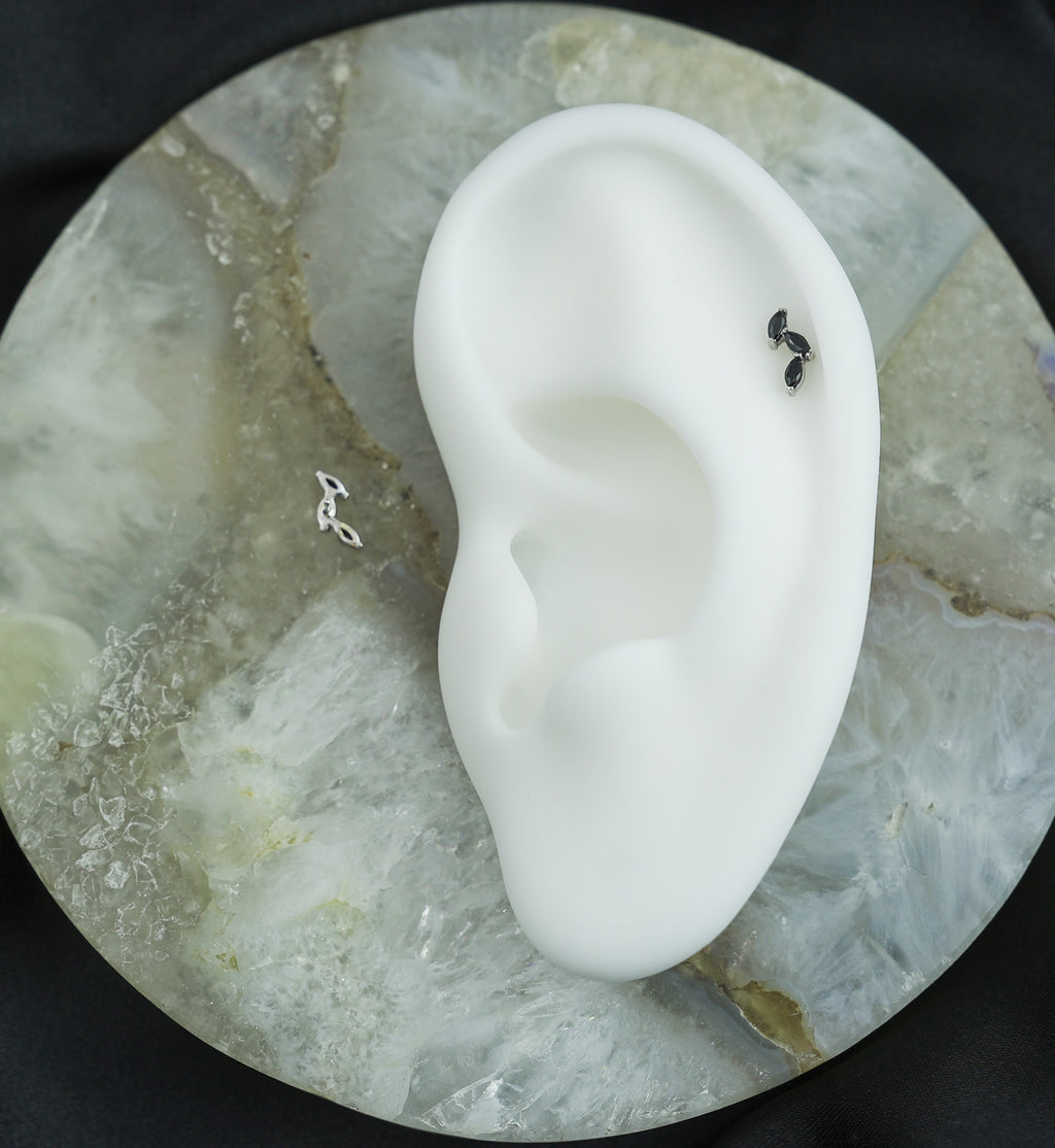 Cool threadless top piece that has a triple, marquise, black cubic zirconia gem design that resembles a growing vine. Made from 14kt nickel-free white gold with a 316L stainless steel pin. Pin size is 25G. Length is approximately 5mm. Top size measures at 10.3mm x 4mm. Sold individually (1pc-top only). Black and white gold top piece for cartilage or tragus ear piercings!