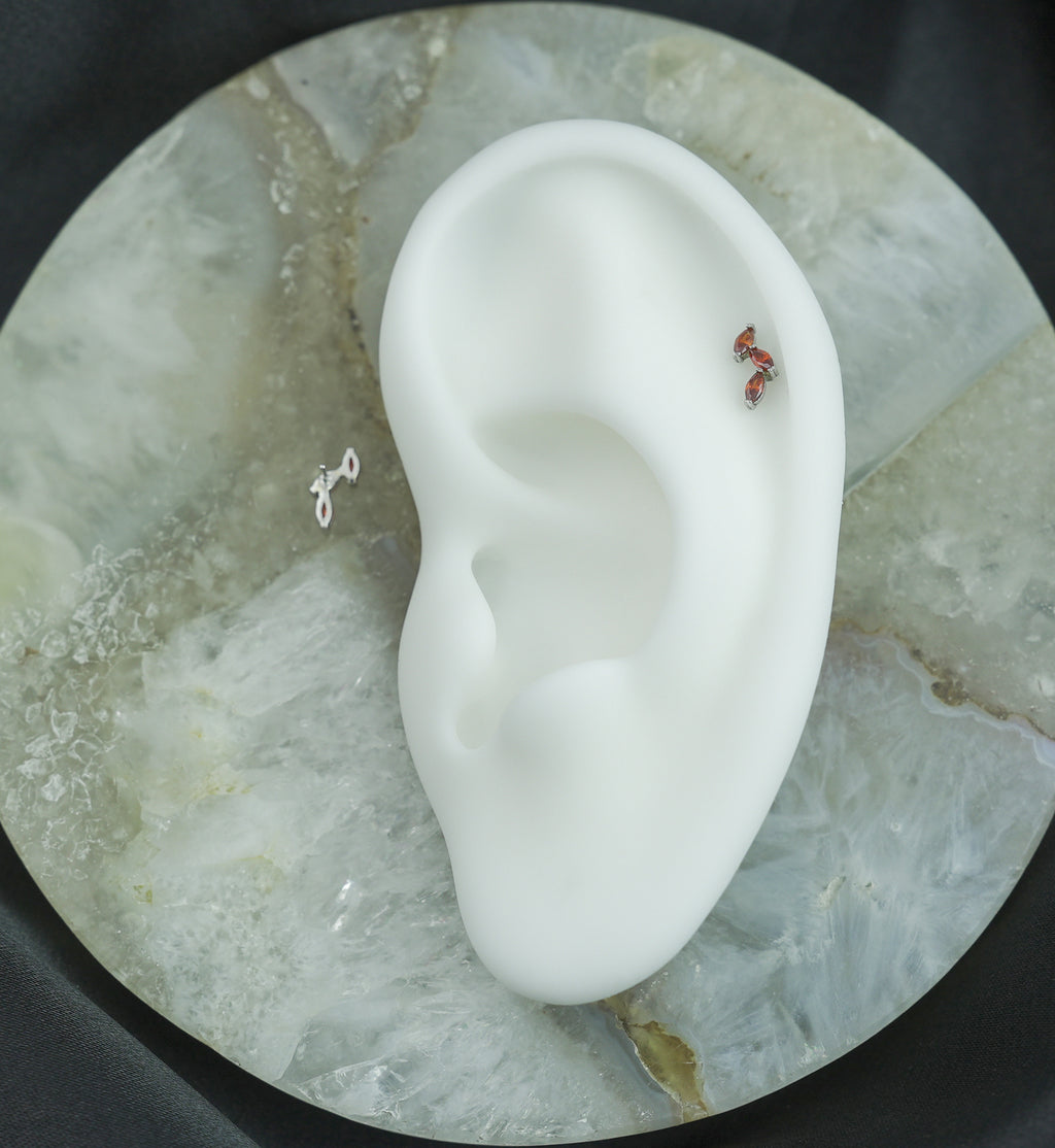 Dainty threadless top piece that has a triple, marquise, red cubic zirconia gem design that resembles a vine. Made from 14kt nickel-free white gold with a 316L stainless steel pin. Pin size is 25G. Length is approximately 5mm. Top size measures at 10.3mm x 4mm. Sold individually (1pc-top only). Cool top piece for cartilage or tragus ear piercings!