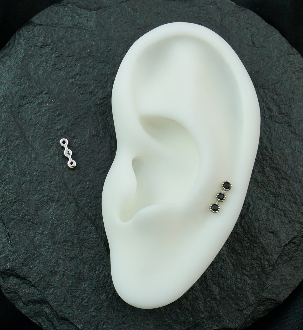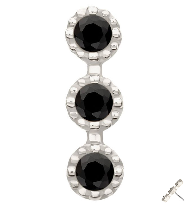 White gold, threadless top piece that has a beaded, stacked, triple black cz gem design. Made from 14kt nickel-free white gold and a 316L stainless steel pin. Pin size is 25G. Pin + design size is approximately 5mm. Top size measures 8.8mm x 2.5mm. Sold individually (top only).