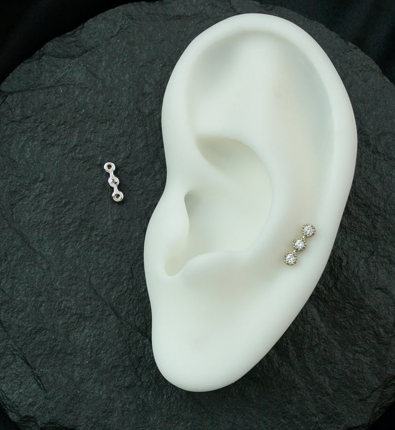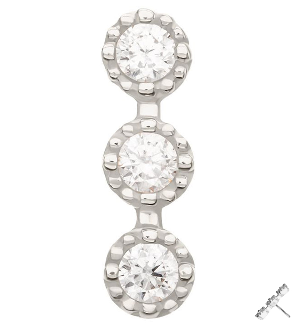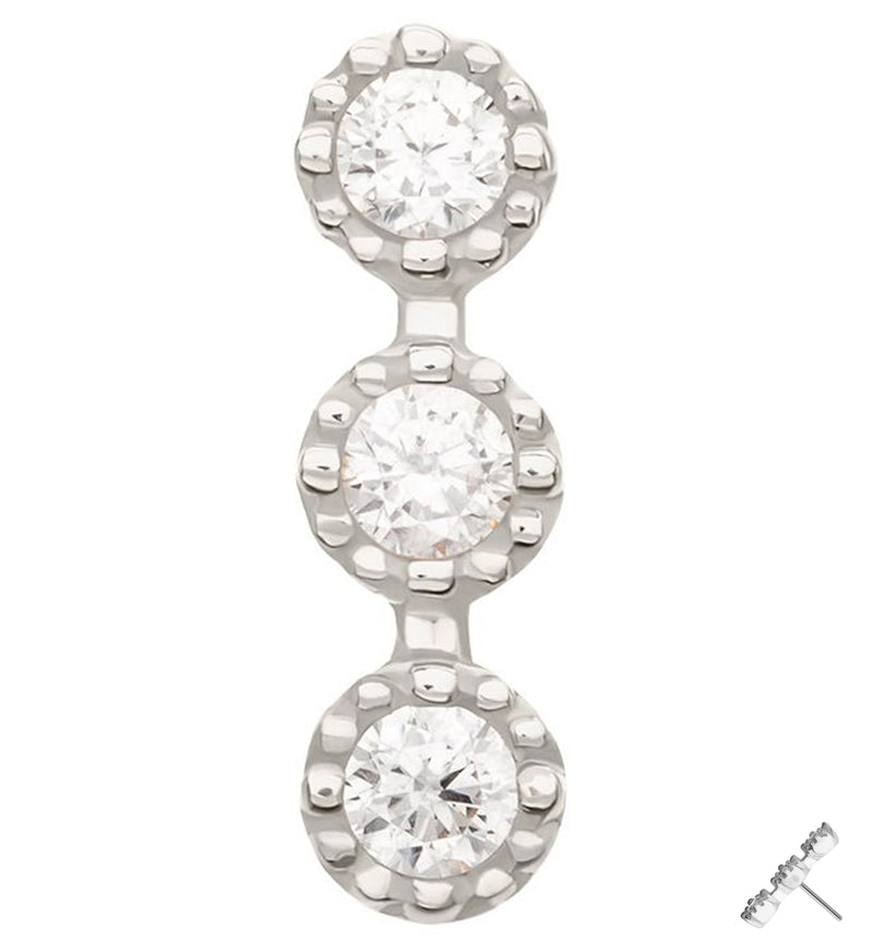 White gold, threadless top piece that has a beaded, stacked, triple clear cz gem design. Made from 14kt nickel-free white gold with a 316L stainless steel pin. Pin size is 25G. Pin + design size is approximately 5mm. Top size measures 8.8mm x 2.5mm. Sold individually (top only).
