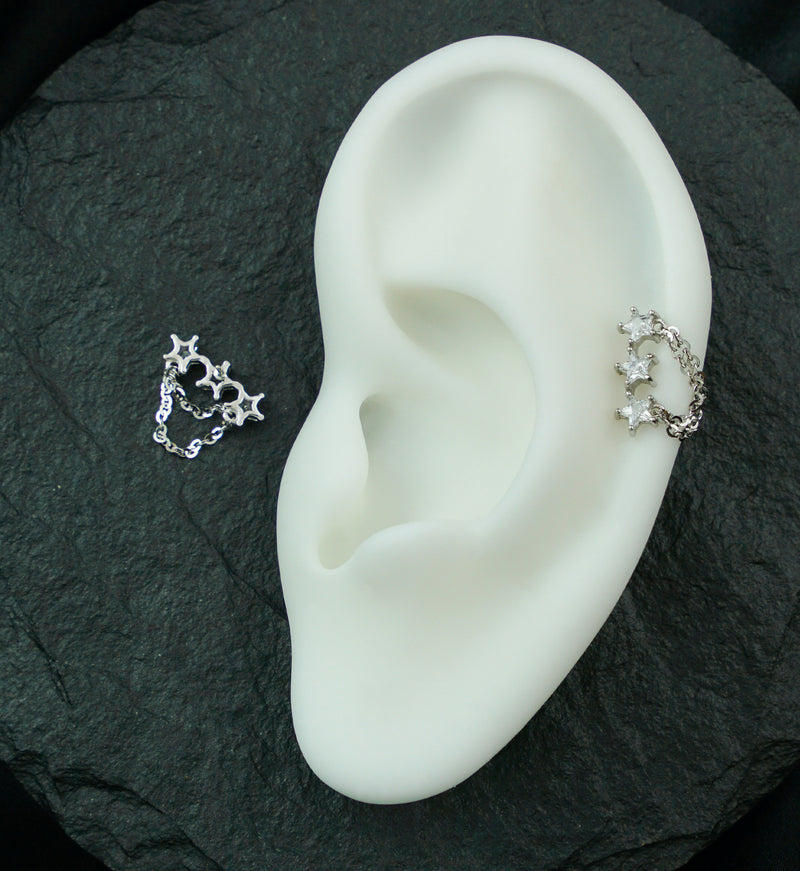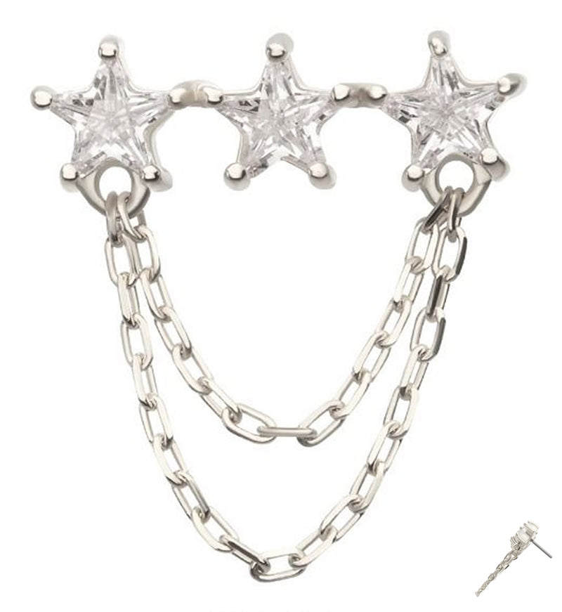 Pretty, threadless top piece that has a triple, clear cz star design with a double dangling chain attached. Made from 14kt nickel-free white gold with a 316L stainless steel pin. Pin size is 25G. Pin length + design size is approximately 5mm. Top size measures 14mm x 12.5mm. Sold individually (top only).