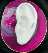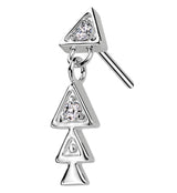 Cute, 14kt nickel-free white gold threadless top piece that has a triangle shape that has a centered, clear cz gem and attached, triple triangle dangle design with accented clear cz gems. Pin size is 25G and fits most threadless posts. The size is about 11mm x 3mm. Dangling piece to add to your cartilage or tragus piercing! Sold individually (1pc).