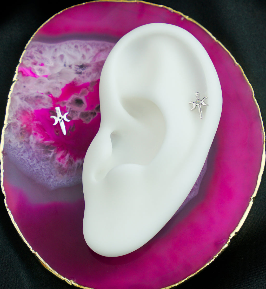 Shimmering, 14kt nickel-free white gold threadless top piece that has a dagger design with handles that resemble a moon phasing. In the middle is a synthetic, white opalite gem that measures about 1.5mm. Pin size is 25G and fits most threadless posts. The size is about 10mm x 5mm. Edgy piece to add to your cartilage or tragus piercing! Sold individually.