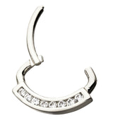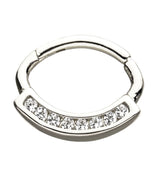 This 16G Airy Hinged Segment Ring features a hinged segment that opens and closes easily for comfort and convenience. It is made of 316L stainless steel and has clear CZ gems, making it perfect for healed piercings in septum, daith, or cartilage. Its size is 16G with an inner diameter of 1/4" and full height of 10mm.