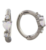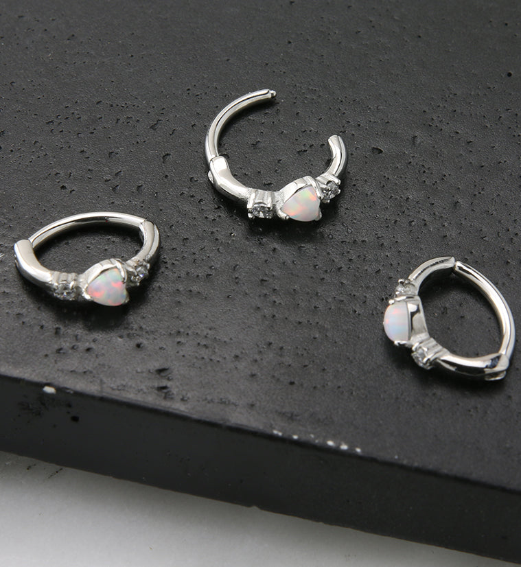 Beautiful rook clicker with a heart shaped white opalite gem, surrounded by 2 clear, cz gems. Made from 316L stainless steel. Size 16G with a 5/16" (8mm) curved bar. Hinge opens and clicks closed. Sold individually. For healed piercings.
