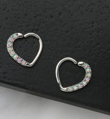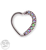Shining heart-shaped daith - cartilage ring with pretty, synthetic opal lined side. Choose left or right piece. Size is 16G. Length is 5/16" (8mm). Made from 316L stainless steel. Sold individually (1 pc). For healed piercings.