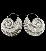 Cute ammonite designed hangers/earrings made from white brass. These weigh about 19 grams each. Made from polished white brass. Brass is not meant for long term wear. It may oxidize under extreme moisture conditions. Width is about 48mm and height is 55mm. Size is 18G. For healed piercings. Sold in pairs (2pcs).