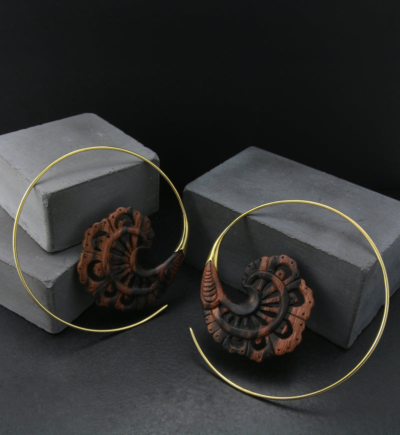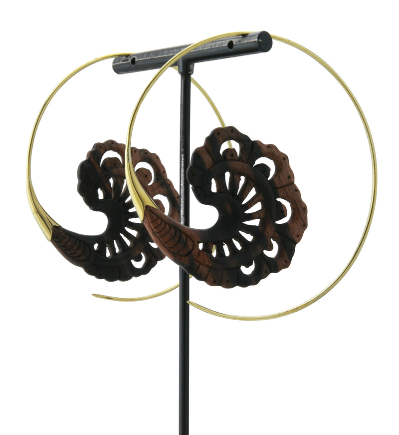Decorative hangers / earrings made from areng wood into beautiful, lightweight design. They are a size 18G and have brass wire. Height is 66mm and width is 66mm. Lightweight. Each piece is handcrafted. Sold in pairs (2 pcs).