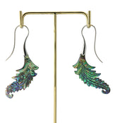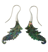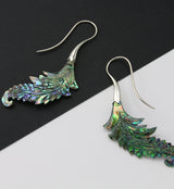 Striking feather-shaped hangers/earrings made from colorful abalone shell. They are a size 18G and have white brass wire. Lightweight. Height is 75mm and width is 22mm. Each piece is handcrafted so it will be unique in pattern and color. Sold in pairs (2 pcs).