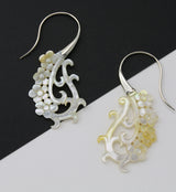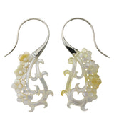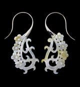 Pretty flower adorned hangers/earrings made from beautiful mother of pearl. They are a size 18G and have white brass wire. Lightweight. Height is 75mm and width is 32mm. Each piece is handcrafted so it will be unique in pattern and color. Sold in pairs (2 pcs).