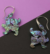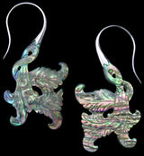 Feathery handcrafted hangers/earrings made from colorful abalone shell in a pretty, carved design. They are a size 18G and have white brass wire. Lightweight. Height is 72mm and width is 40mm. Each piece is handcrafted and unique in pattern and color. Sold in pairs (2 pcs).