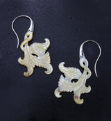 Handcrafted hangers/earrings made from shiny mother of pearl shell in a pretty, carved design. They are a size 18G and have white brass wire. Lightweight. Height is 72mm and width is 40mm. Each piece is handcrafted and unique in pattern and color. Sold in pairs (2 pcs).