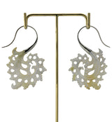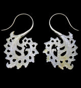 Handcrafted hangers/earrings made from shiny mother of pearl in a pretty, feathery design. They are a size 18G and have white brass wire. Lightweight. Height is 66mm and width is 40mm. Each piece is handcrafted and unique in pattern and color. Sold in pairs (2 pcs).