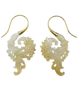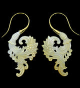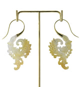 Handcrafted hangers/earrings made from mother of pearl with beautiful carvings throughout. They are a size 18G and have brass wire. Lightweight. Height is 78mm and width is 35mm. Each piece will be unique in pattern and color. Sold in pairs (2 pcs). For healed piercings/lobes.