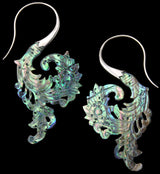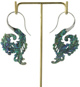 Handcrafted hangers/earrings made from abalone shell with beautiful carvings throughout. They are a size 18G and have white brass wire. Lightweight. Height is 78mm and width is 35mm. Each piece will be unique in pattern and color. Sold in pairs (2 pcs). For healed piercings/lobes.