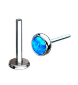 Titanium threadless labrets with a synthetic blue opal gem on top. Size is 18G. Choose your length, gem size and disk size from the drop down menu! Made from ASTM F-136 titanium. Threadless. Sold in 2 pieces: top and post.