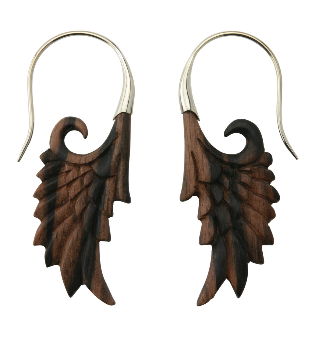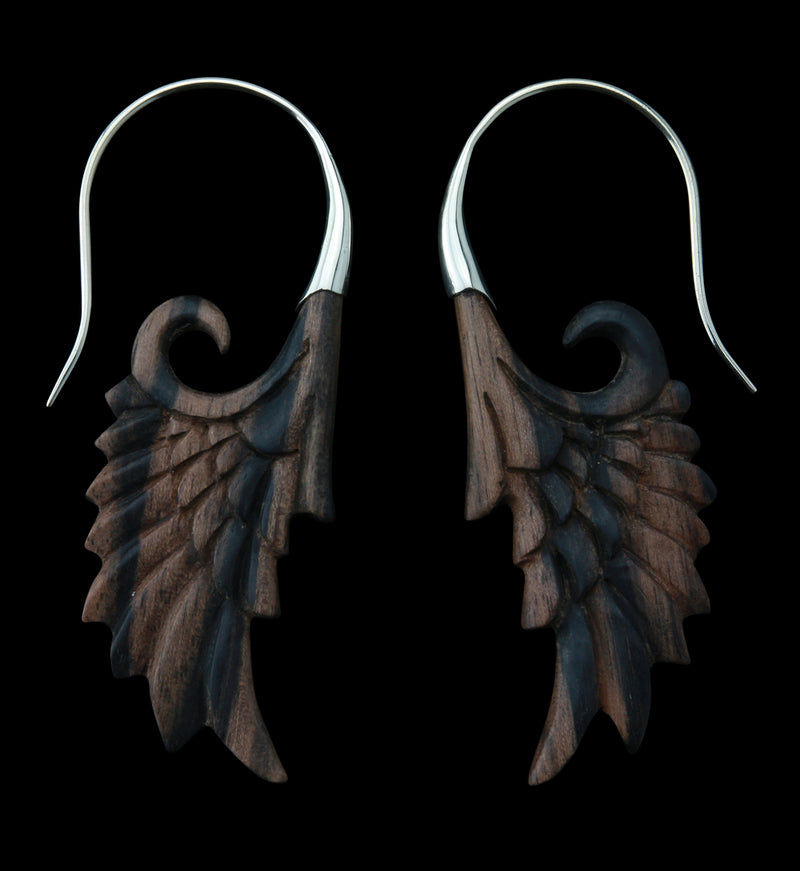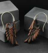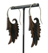 Wooden hangers/earrings in a decorative, winged design. They are made from areng wood and are lightweight. They are a size 18G and have white brass wire. Height is 63mm and width is 24mm. Lightweight. Each piece is handcrafted. Sold in pairs (2 pcs).