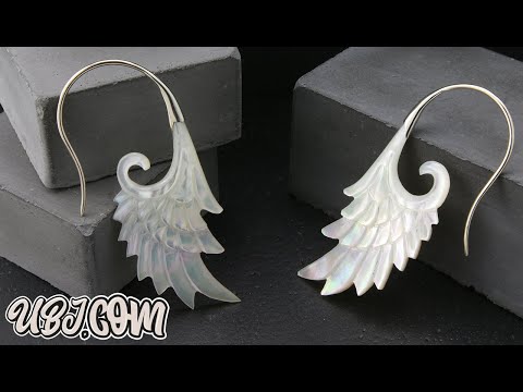 Winged hangers/earrings with a decorative design. They are made from shiny mother of pearl and are lightweight. They are a size 18G and have white brass wire. Height is 63mm and width is 24mm. Each piece is handcrafted. Sold in pairs (2 pcs).