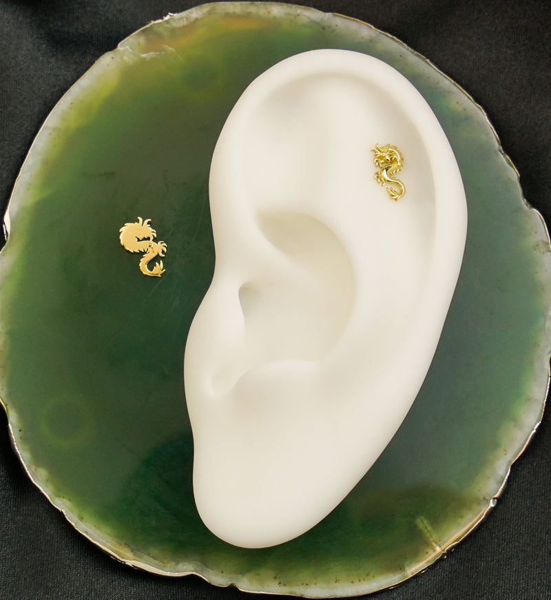 18kt solid gold threadless piece that has a mystical dragon design. Easy to fit on most threadless posts, it measures about 10mm x 6mm. The pin is about 25G and is made from 316L stainless steel. Such a fun piece for your cartilage or tragus piercing! Sold individually (top only).
