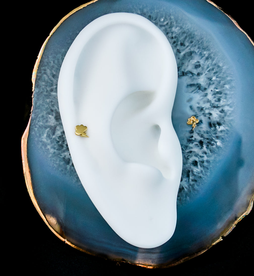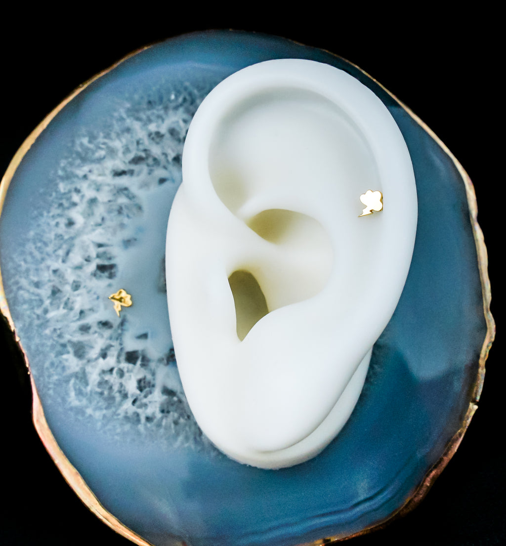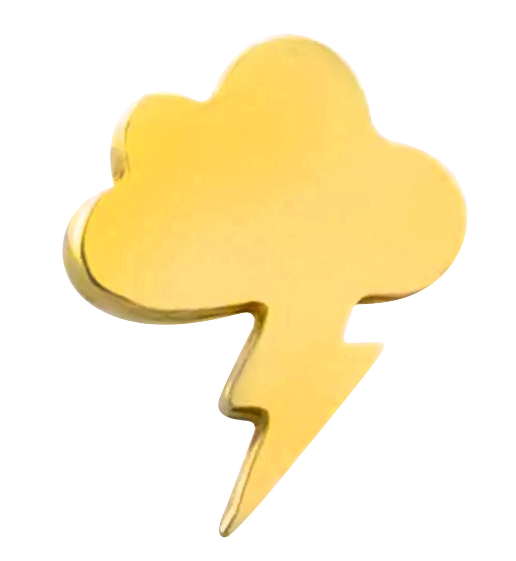 18kt solid gold threadless piece that has a cloud design with a lightning bolt coming out of it. Easy to fit on most threadless posts, it measures about 5mm. Choose either right or left for your right side or left side! Sold individually (top only).