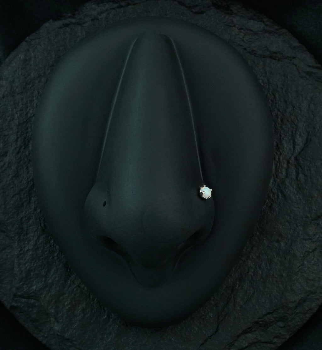 Made with 14kt white gold and featuring a 2mm synthetic opalite, this individual nose ring is perfect for adding a pop of rainbow shimmer. With a length of 1/4" (6mm), it's a great fit for nostril piercings.