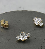 Golden, regal internally threaded top piece that has 2 clear, square cz gems on either side of an emerald-cut cz gem. Made from 24kt gold pvd on ASTM F-136 titanium. Measures about 7.3mm x 4.5mm. M0.9 threading. Fits 16G internally threaded posts. Sold individually (top piece only).