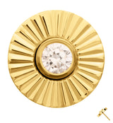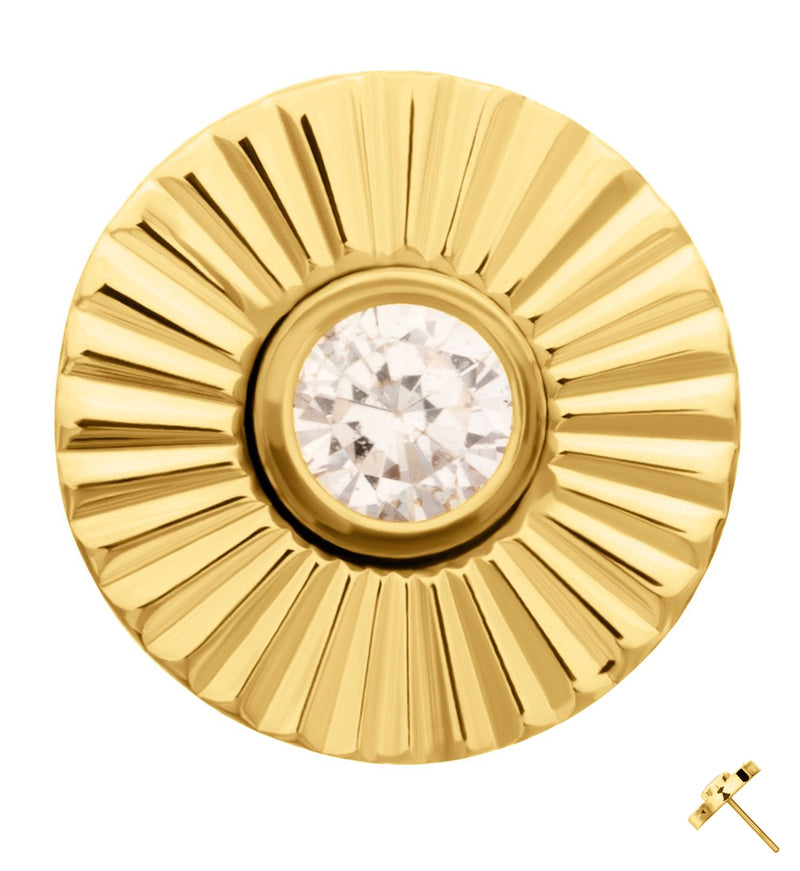Golden, threadless top piece with a corrugated disk design with a clear cz gem in the center. The disk size options are: 3mm, 4mm, 5mm, or 6mm. It is made from 24kt gold pvd on ASTM F-136 titanium. Pin size is 25G. Fits most threadless posts. Sold individually (top only).