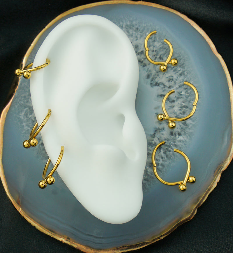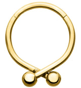 Hinged segment ring made from 24kt gold pvd on ASTM F-136 titanium with a hoop shape that has two ball ends that cross over each other at the bottom. Size is 16G with an inner diameter size of either 5/16"(8mm), 3/8" (10mm) or 7/16" (11mm). The hinged design makes this piece effortless to put in and remove. Cool piece for septum, cartilage or conch piercings! Sold individually (1pc).