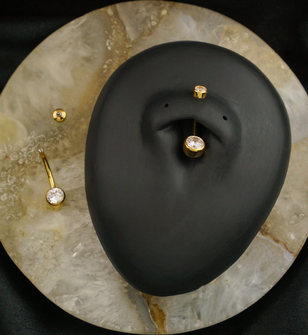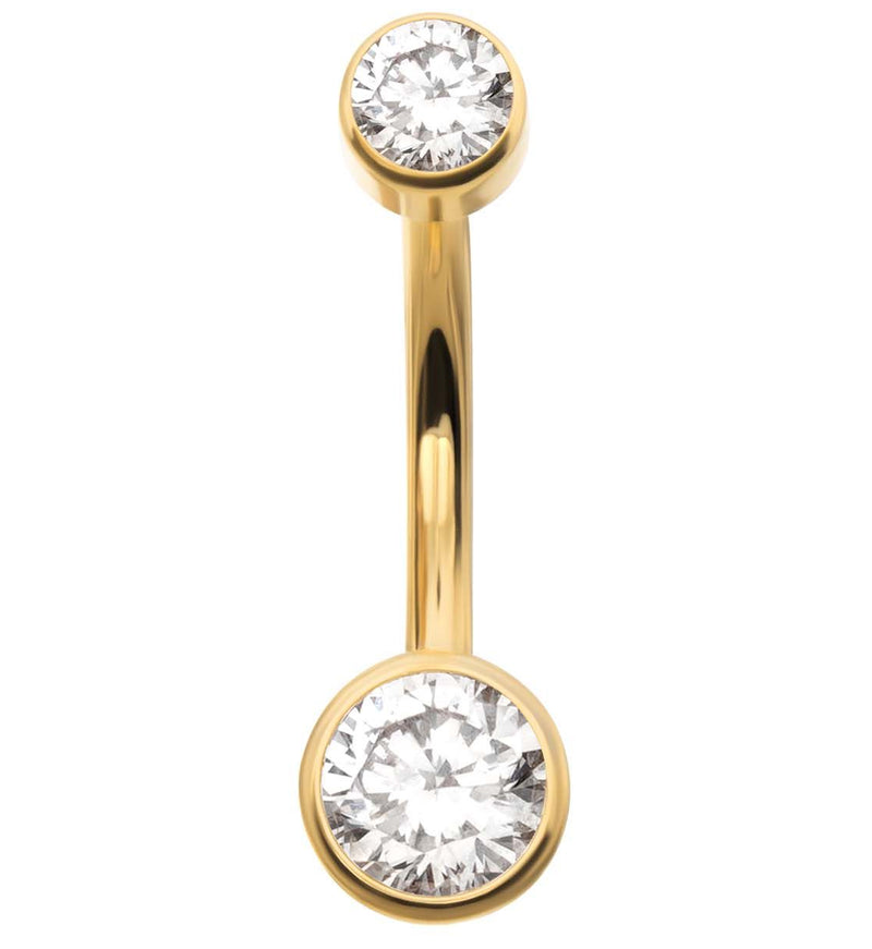 Internally threaded belly button ring made from 24kt gold PVD on ASTM F-136 titanium and 2 sparkling, bezel set clear cz gems. The gems sit in a bezel design that is flat on the back instead of rounded. Size 14G. Choose your barbell length from 3/8" (10mm), 7/16" (11mm) and 1/2" (12mm). The titanium is milled in Japan. Gem sizes are 4mm and 6mm. Sold individually. For healed piercings.