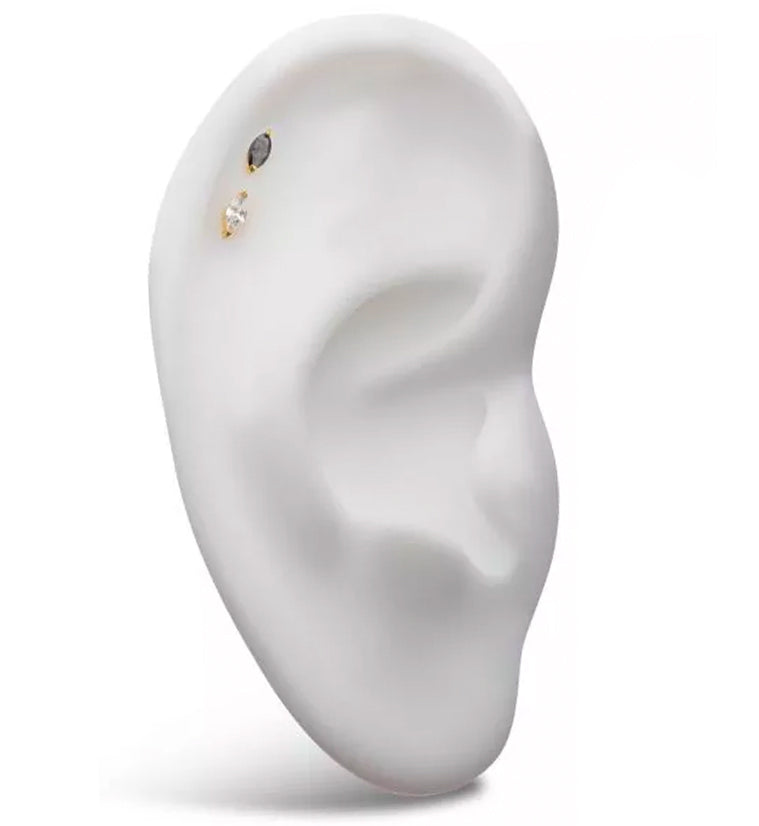 Golden threadless top piece that has a marquise, clear cubic zirconia gem in a 2-prong set. Made from 24kt gold pvd on ASTM F-136 titanium. Measures about 5mm x 2mm. Fits most threadless posts. Sold individually (top piece only).