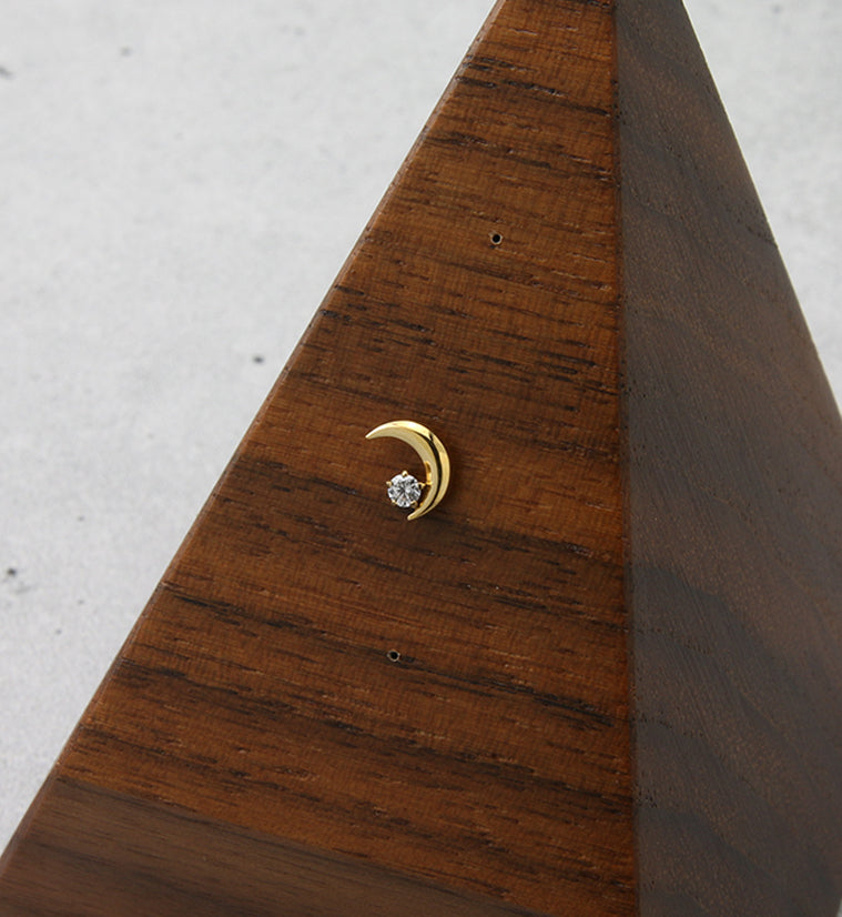 Golden threadless top piece that has a crescent moon shape design and an accented clear cz gem. Made from 24kt gold pvd on ASTM F-136 titanium. Measures about 6mm x 4mm. 25G pin. Fits most threadless posts. Sold individually (top piece only).