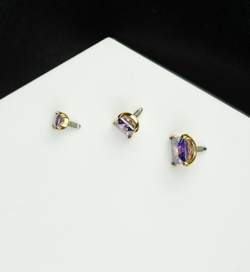 Top piece that has a square-shaped, prong-set, amethyst purple cz gem design. Made from 24kt gold pvd on ASTM F-136 titanium and is internally threaded. Size is 16G and it has M0.9 threading. Choose your gem size from 2mm, 3mm and 4mm. Sold individually (top piece only).