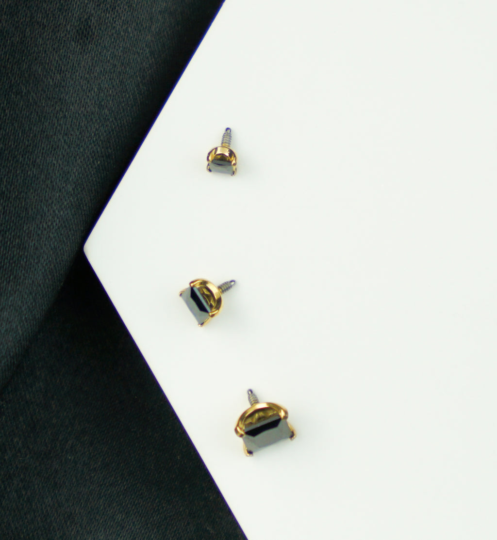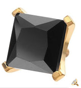 Dark top piece that has a square-shaped, black cz gem design set in a prong setting that is made from 24kt gold pvd on ASTM F-136 titanium. Internally threaded. Size is 16G and it has M0.9 threading. Available in three gem sizes: 2mm, 3mm and 4mm. Sold individually (top piece only).