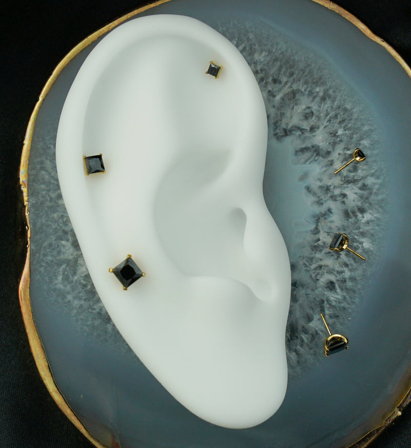 Threadless top piece that has a square-shaped, prong-set, black cz gem design. Made from 24kt gold pvd on strong ASTM F-136 titanium. 25G pin. Fits most threadless posts. Gem sizes: 2mm, 3mm and 4mm. Sold individually (top piece only).