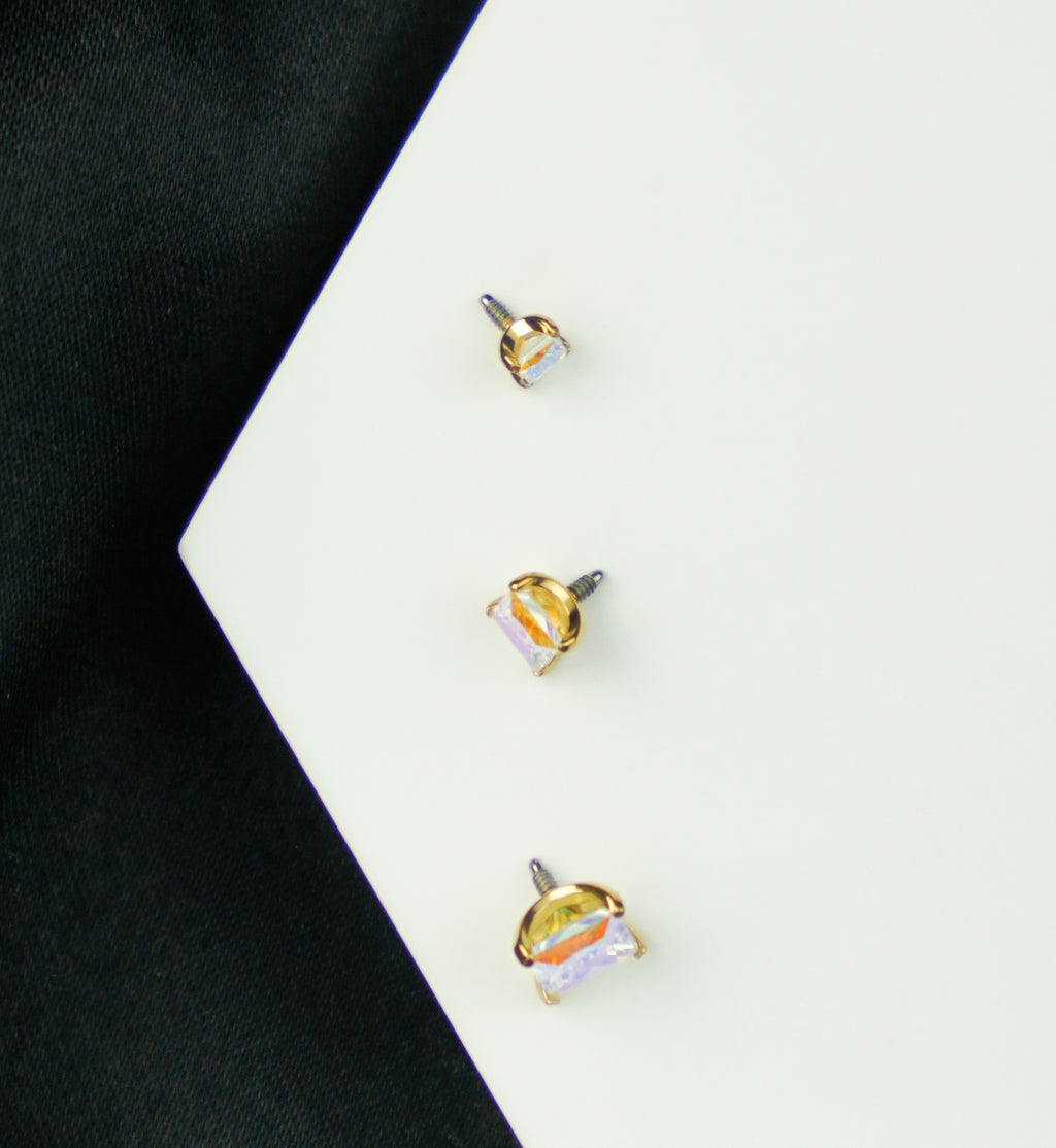 Colorful top piece that has a square-shaped, rainbow aurora cz gem design set in a prong setting that is made from 24kt gold pvd on ASTM F-136 titanium and is internally threaded. Size is 16G and it has M0.9 threading. Available in three gem sizes: 2mm, 3mm and 4mm. Sold individually (top piece only).