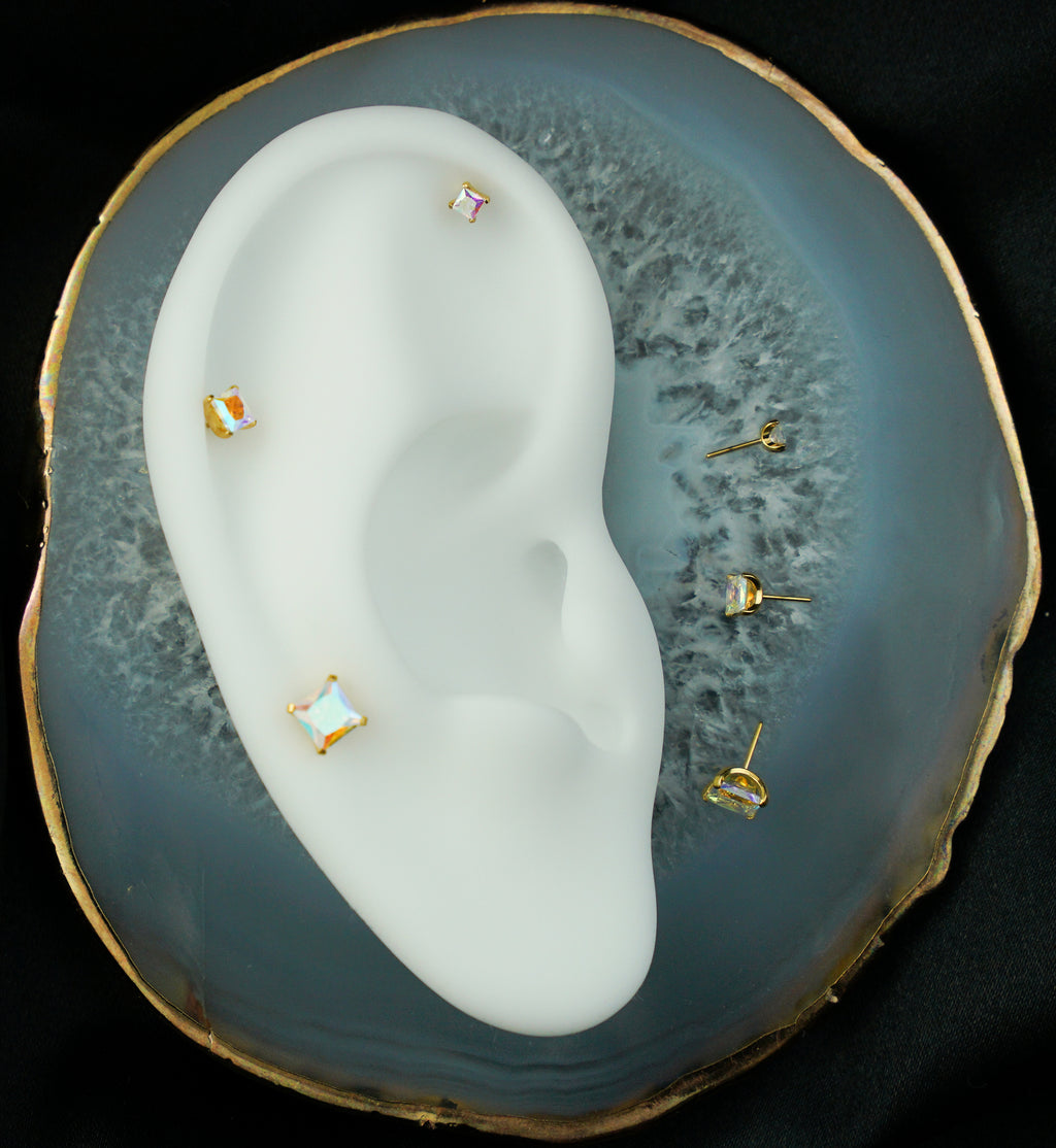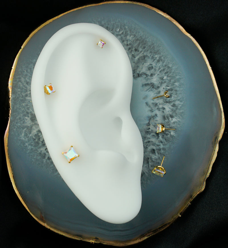 Gold lined, threadless top piece that has a diamond-shaped, prong-set, rainbow aurora cz gem design. Made from 24kt gold pvd on ASTM F-136 titanium. Fits most threadless posts with a 25G pin. Choose your gem size from 2mm, 3mm and 4mm. Sold individually (top piece only).