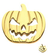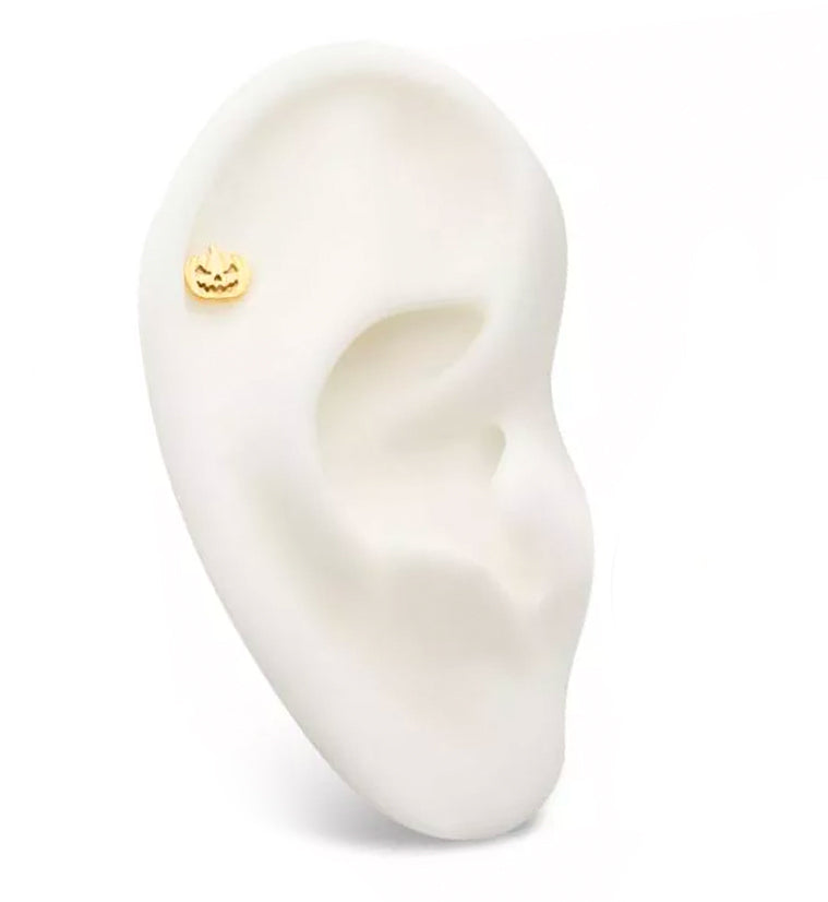 Spooky threadless top piece that has a pumpkin design with a carved out angry face. Made from 24kt gold pvd on ASTM F-136 titanium. Measures about 6mm x 6mm. Fits most threadless posts. Sold individually (top piece only).