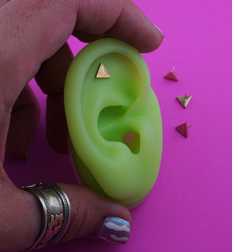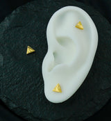 Threadless top piece that has a 6mm corrugated triangle design. Pin is 25G and fits most threadless posts. Made from 24kt gold pvd on ASTM F-136 titanium. Design measures about 6mm. Sold individually (1pc, top only).