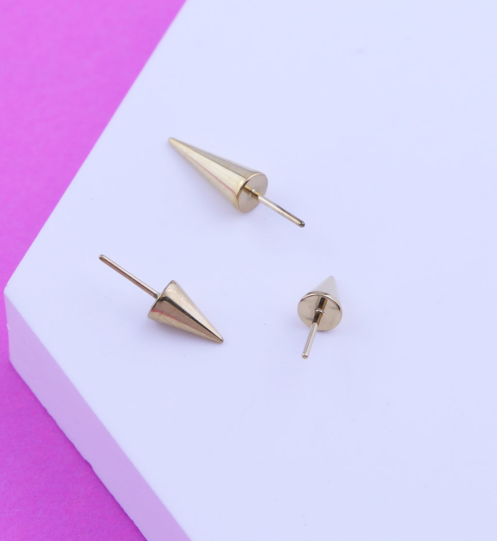 Golden threadless push pin tops with a pointed, spike design. Available in sizes 3x4mm, 4x3mm, 4x4mm, 5x3mm and 8x3mm. Made from durable 24kt gold pvd on ASTM F-136 titanium. Pin size is 25G, which makes this piece easy to fit with most threadless posts. Sold individually (1pc - top only).