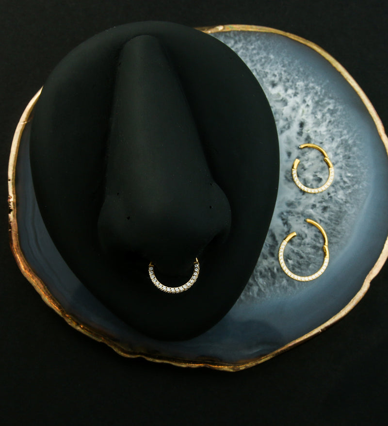Hinged segment ring made from 24kt gold pvd on ASTM F-136 titanium with sparkling, clear cz gems surrounding the bottom side of the hoop. Size is 18G. Choose your inner diameter size from 5/16" (8mm) or 3/8" (10mm). The hinged design makes this piece easy to insert and remove. Sold individually (1pc).
